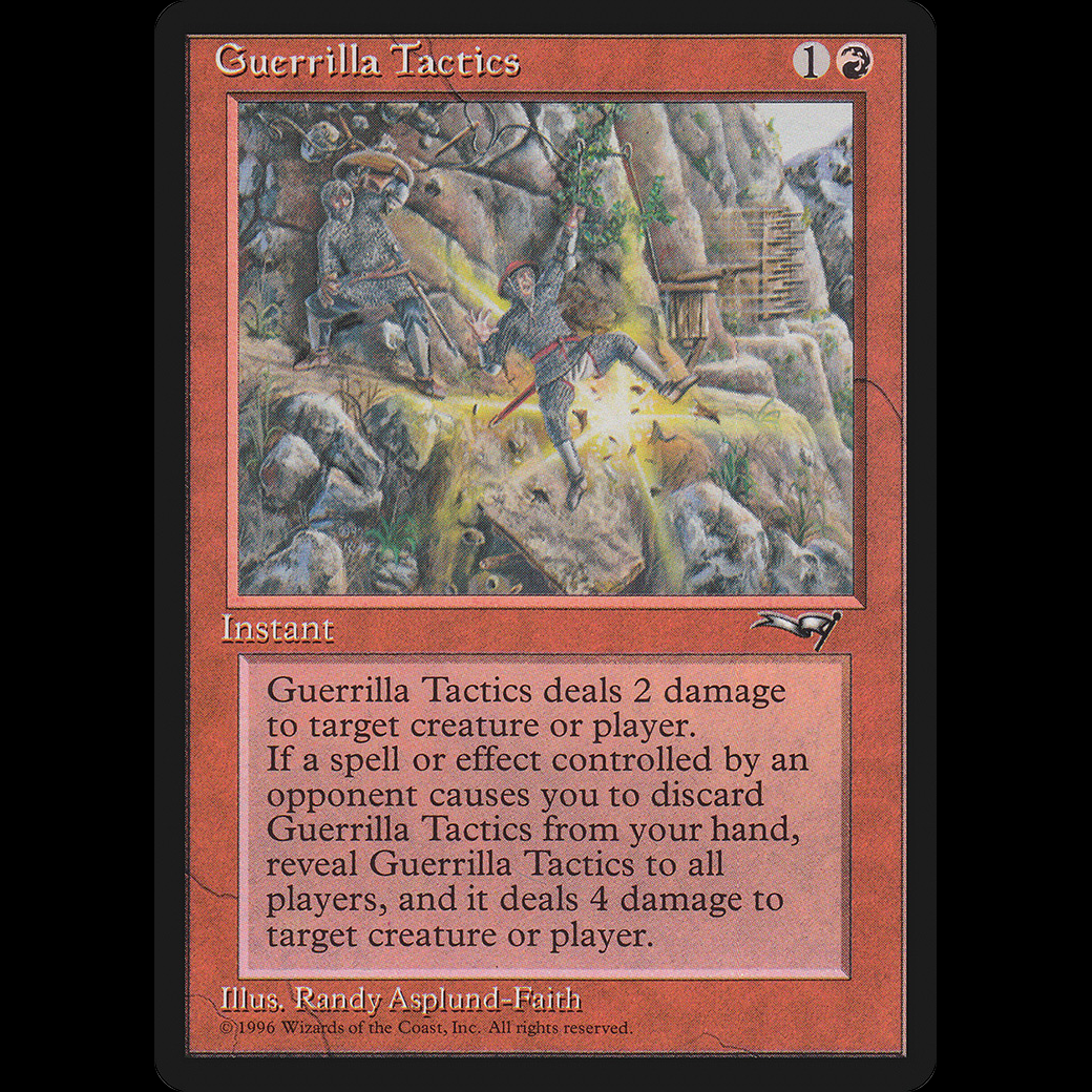 When a spell or ability an opponent controls causes you to discard Guerrilla Tactics, Guerrilla Tactics deals 4 damage to any target.