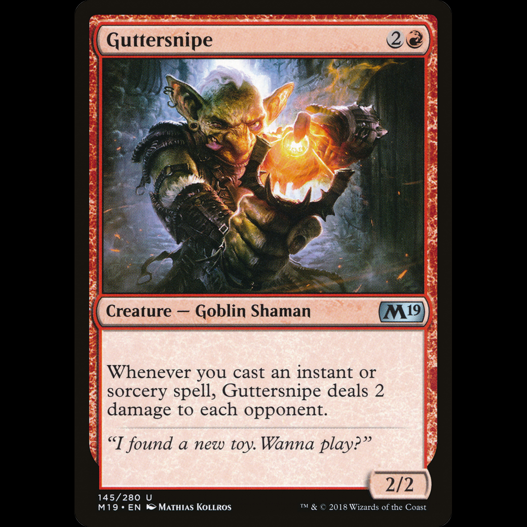 Whenever you cast an instant or sorcery spell, Guttersnipe deals 2 damage to each opponent.