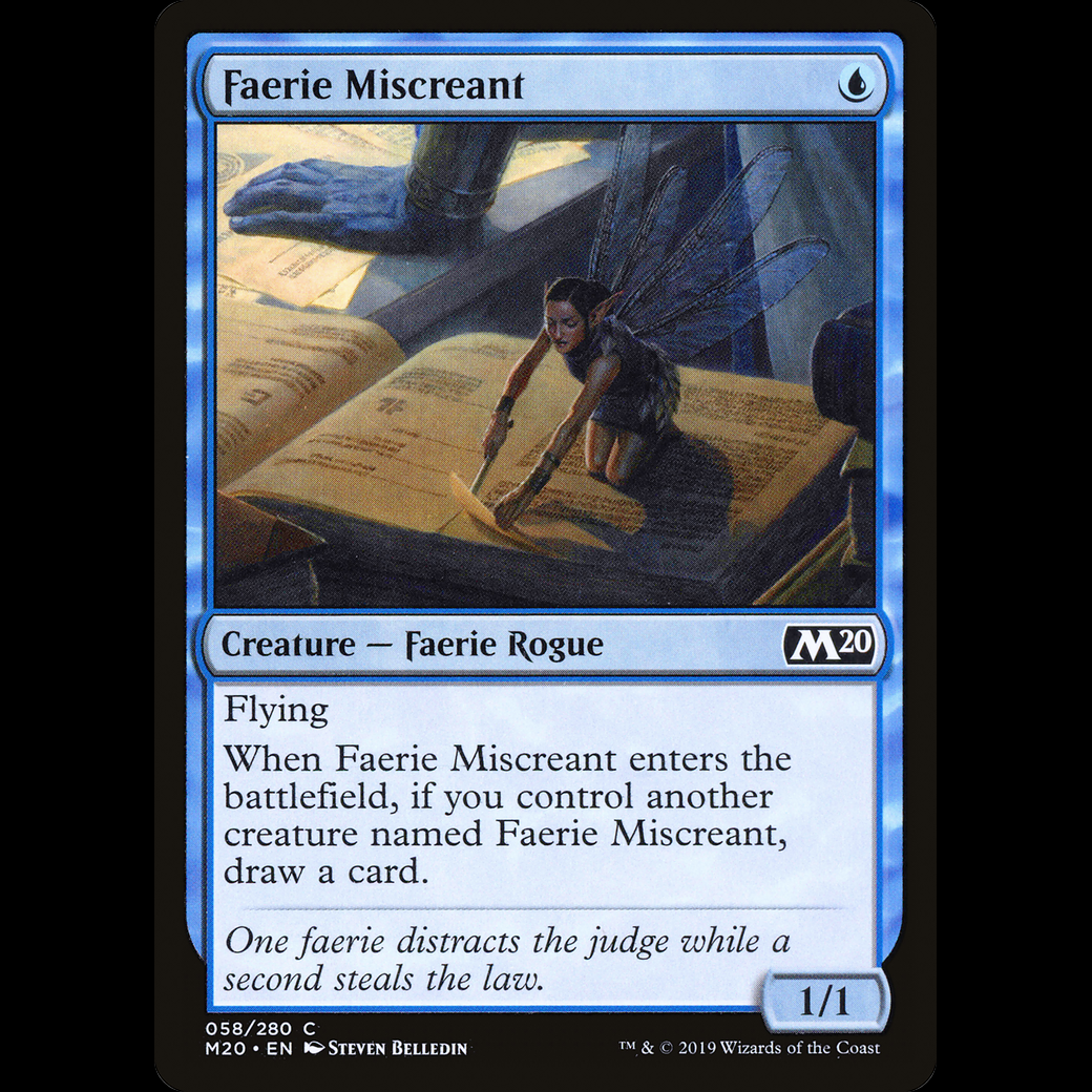 When this creature enters, if you control another creature named Faerie Miscreant, draw a card.