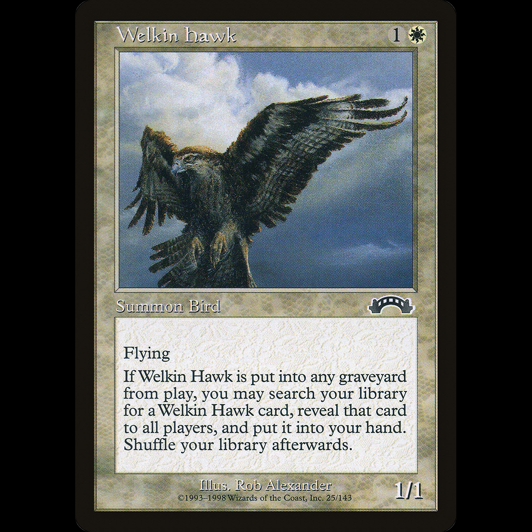 When Welkin Hawk dies, you may search your library for a card named Welkin Hawk, reveal that card, put it into your hand, then shuffle.