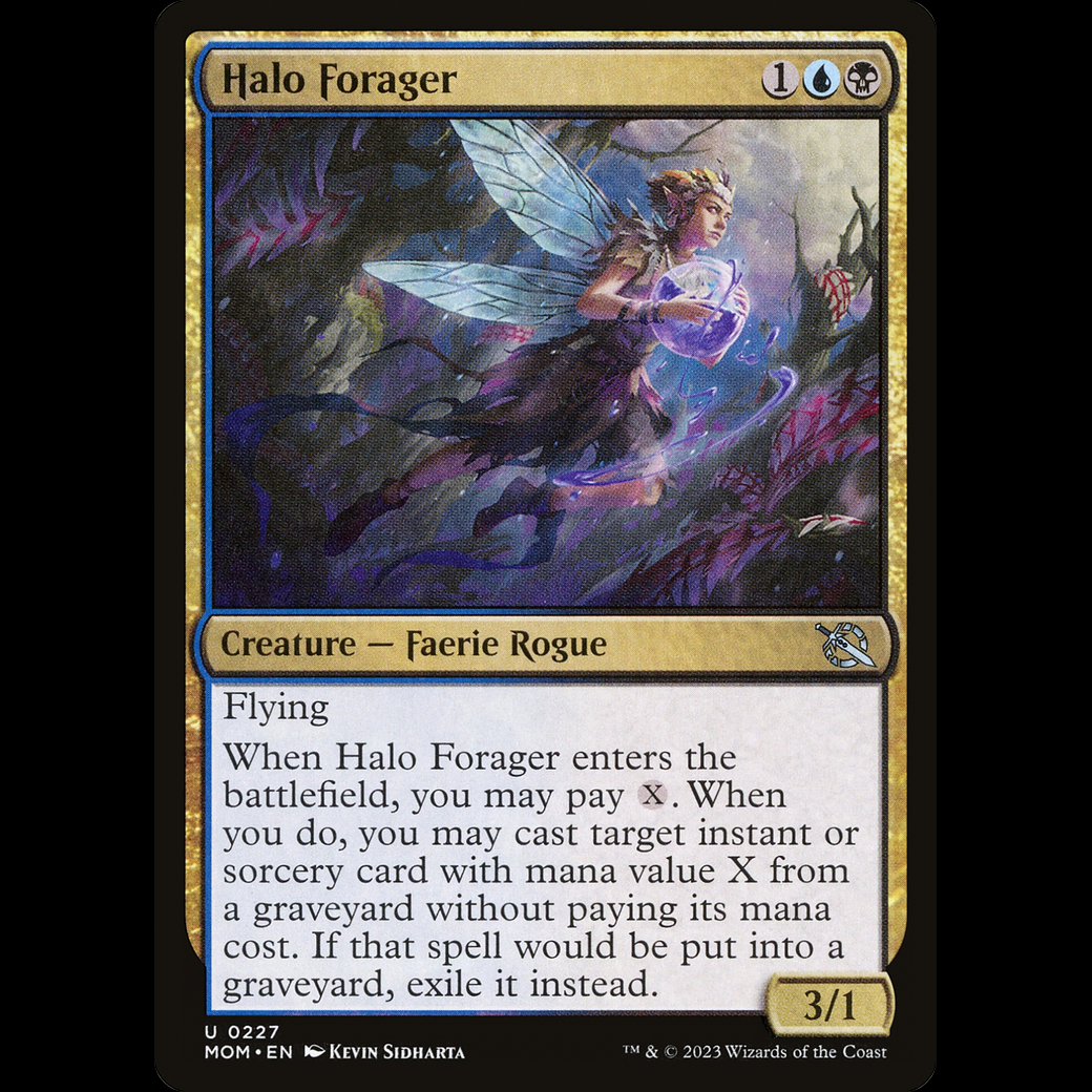 When Halo Forager enters, you may pay . When you do, you may cast target instant or sorcery card with mana value X from a graveyard without paying its mana cost. If that spell would be put into a graveyard, exile it instead.