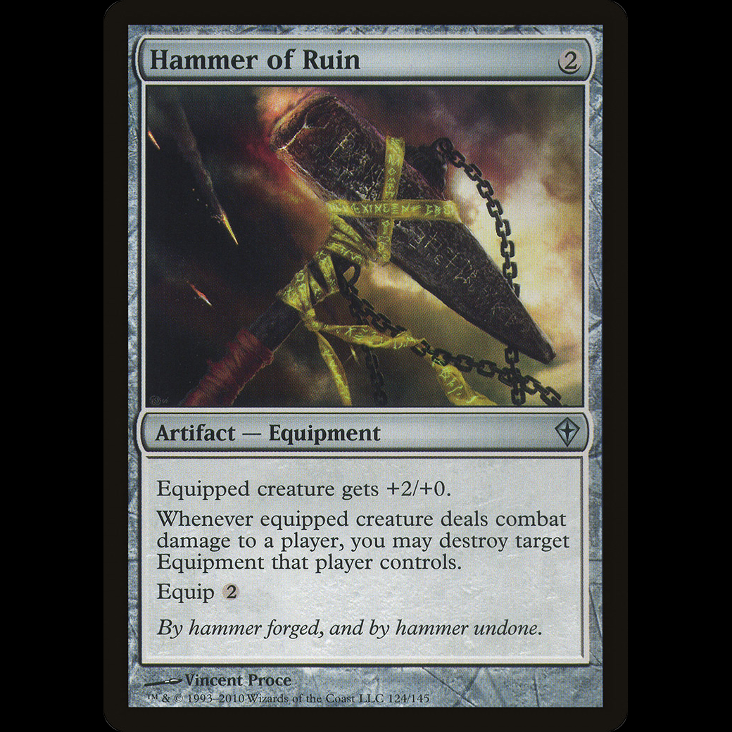 Whenever equipped creature deals combat damage to a player, you may destroy target Equipment that player controls.