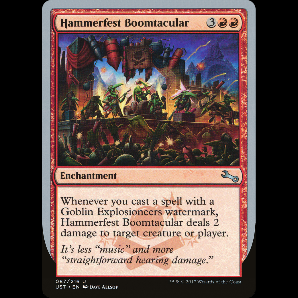 Whenever you cast a spell with a Goblin Explosioneers watermark, this enchantment deals 2 damage to any target.