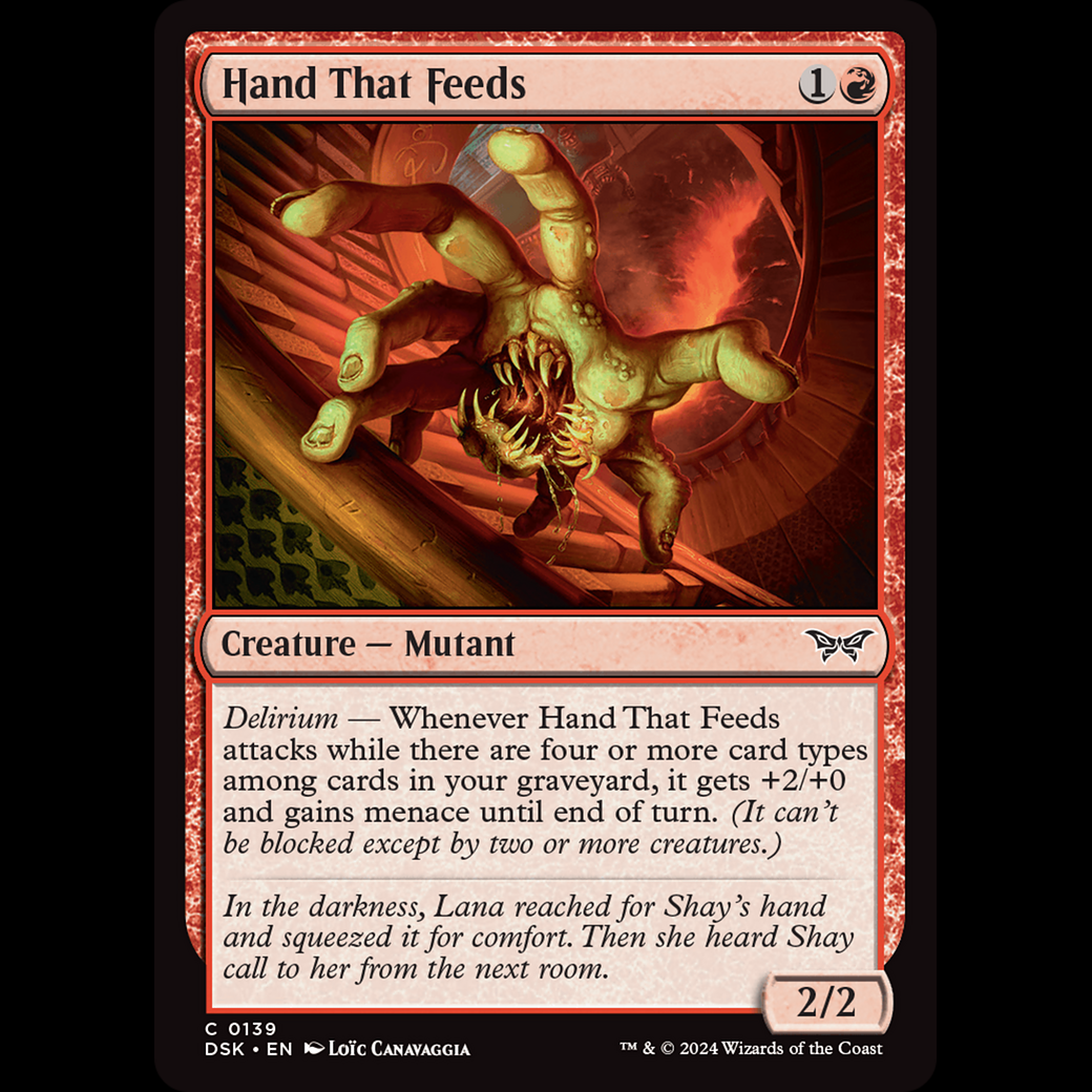 Delirium — Whenever Hand That Feeds attacks while there are four or more card types among cards in your graveyard, it gets +2/+0 and gains menace until end of turn. (It can't be blocked except by two or more creatures.)