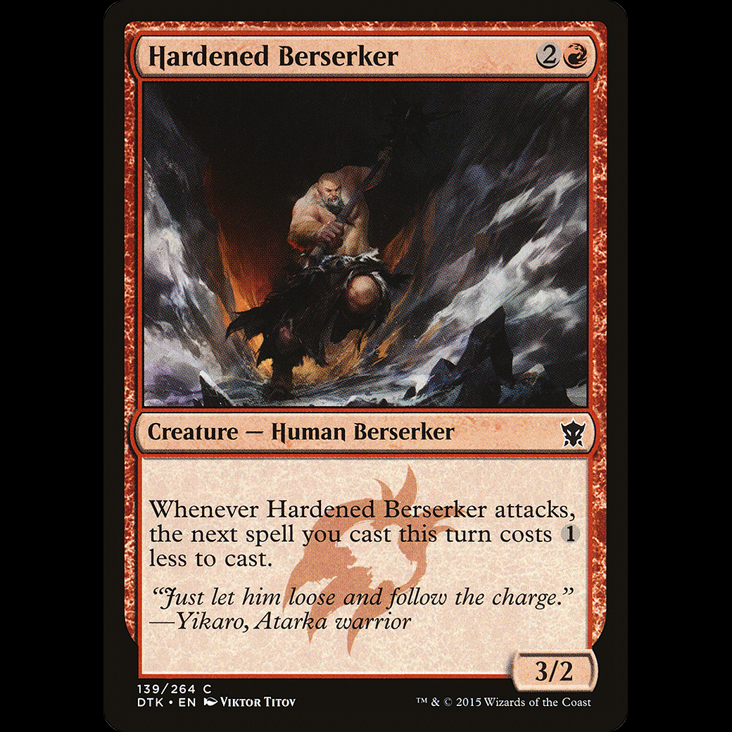 Whenever Hardened Berserker attacks, the next spell you cast this turn costs less to cast.