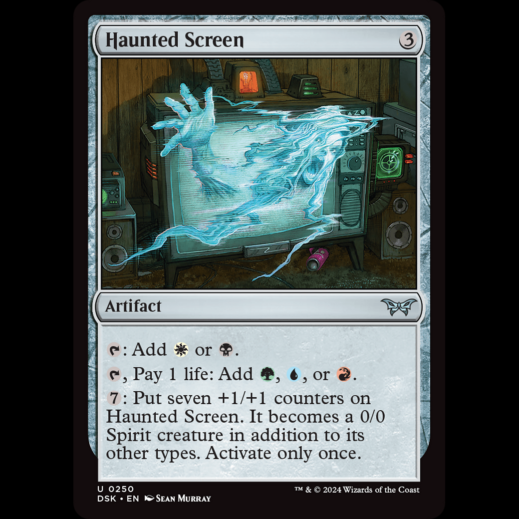 : Add or . , Pay 1 life: Add , , or . : Put seven +1/+1 counters on Haunted Screen. It becomes a 0/0 Spirit creature in addition to its other types. Activate only once.