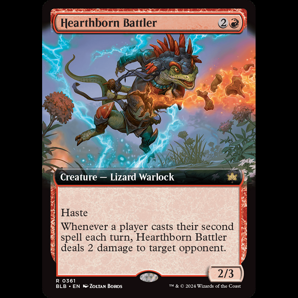Whenever a player casts their second spell each turn, Hearthborn Battler deals 2 damage to target opponent.