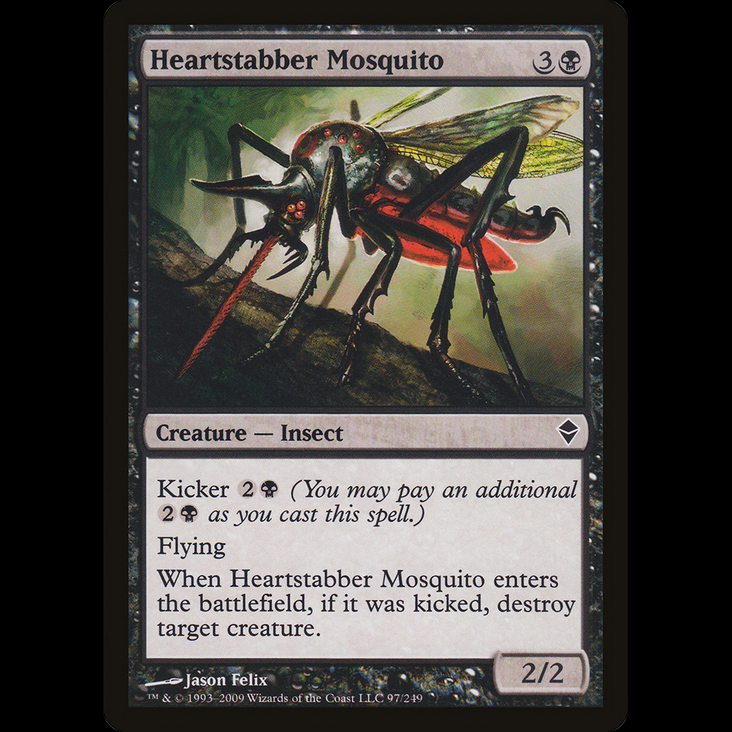 When Heartstabber Mosquito enters the battlefield, if it was kicked, destroy target creature.