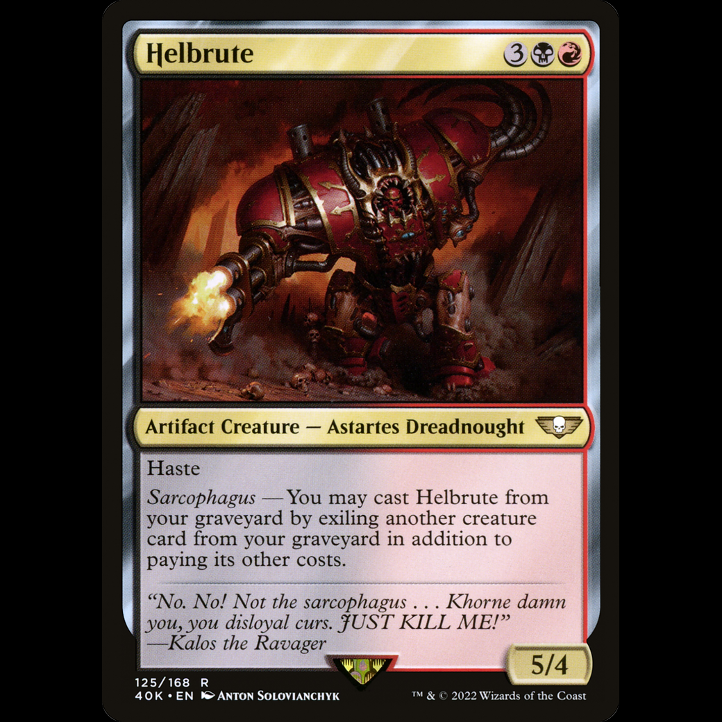 MTG Helbrute Warhammer 40,000 Commander 40k#125 Haste Sarcophagus — You may cast Helbrute from your graveyard by exiling another creature card from your graveyard in addition to paying its other costs.