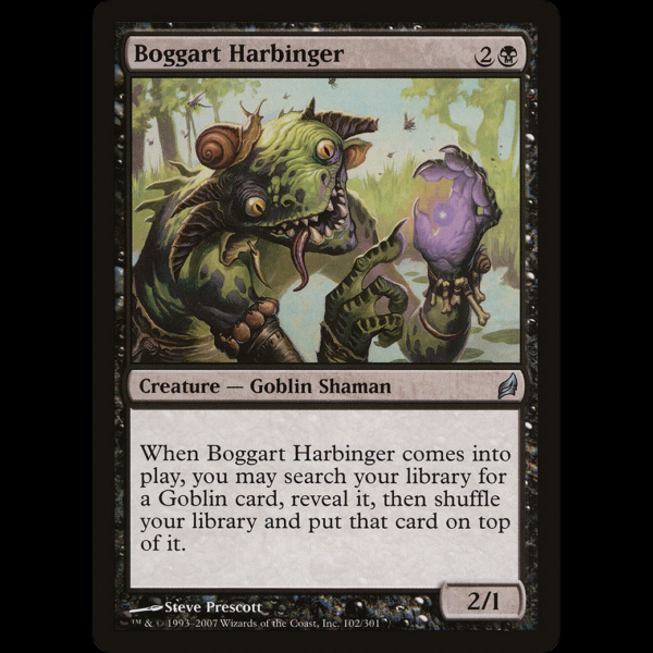 When Boggart Harbinger enters the battlefield, you may search your library for a Goblin card, reveal it, then shuffle and put that card on top.