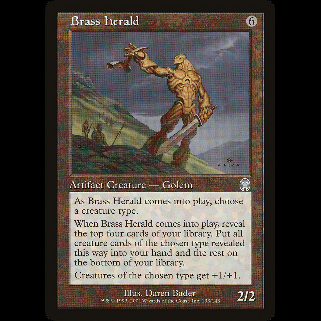 When Brass Herald enters the battlefield, reveal the top four cards of your library. Put all creature cards of the chosen type revealed this way into your hand and the rest on the bottom of your library in any order.