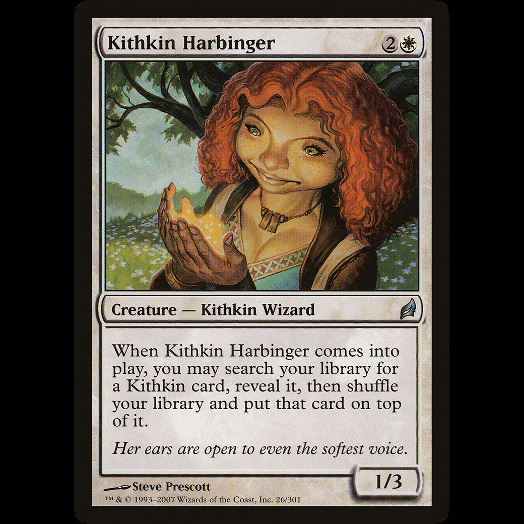 When Kithkin Harbinger enters the battlefield, you may search your library for a Kithkin card, reveal it, then shuffle and put that card on top.