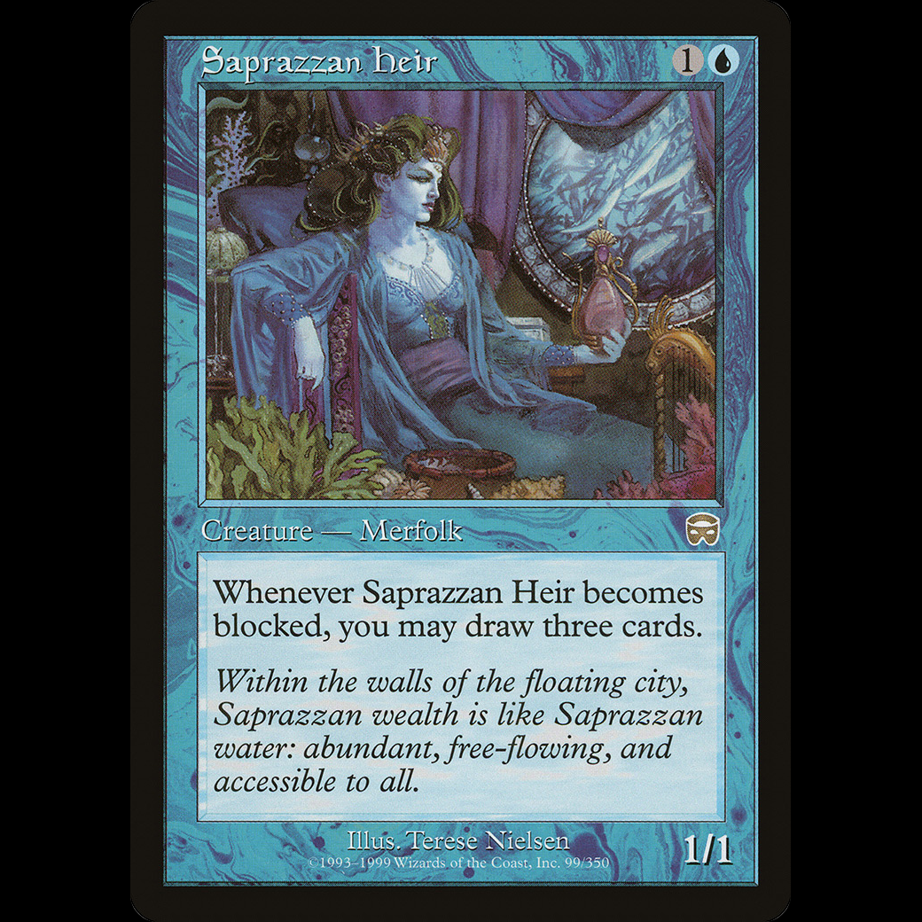 Whenever Saprazzan Heir becomes blocked, you may draw three cards.