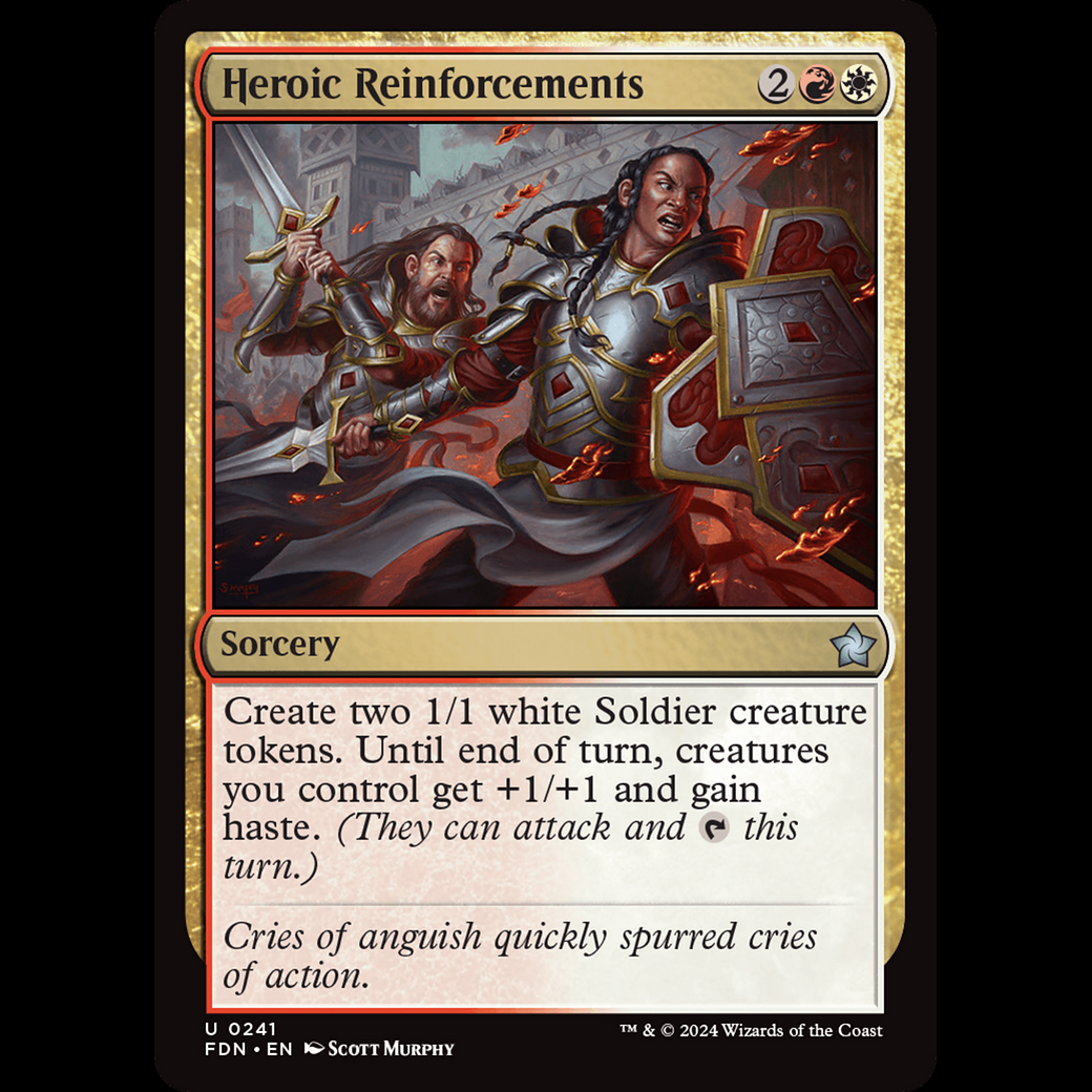 Create two 1/1 white Soldier creature tokens. Until end of turn, creatures you control get +1/+1 and gain haste. (They can attack and this turn.)