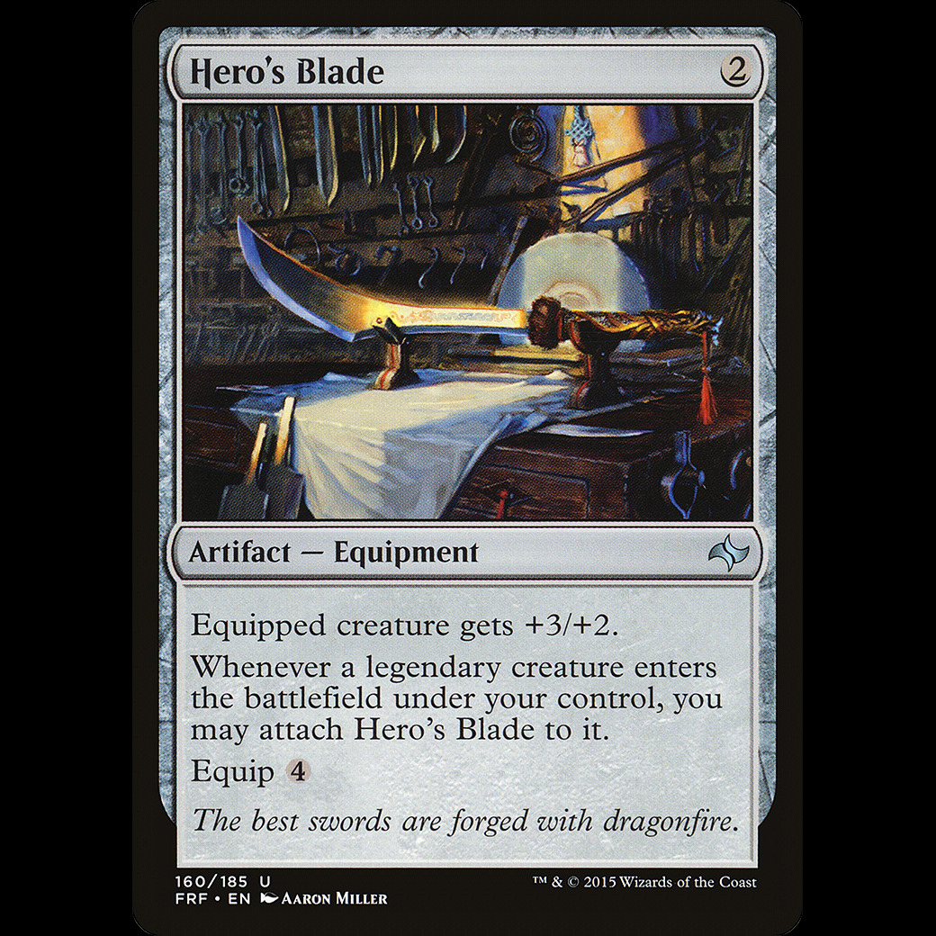 Whenever a legendary creature enters the battlefield under your control, you may attach Hero's Blade to it.