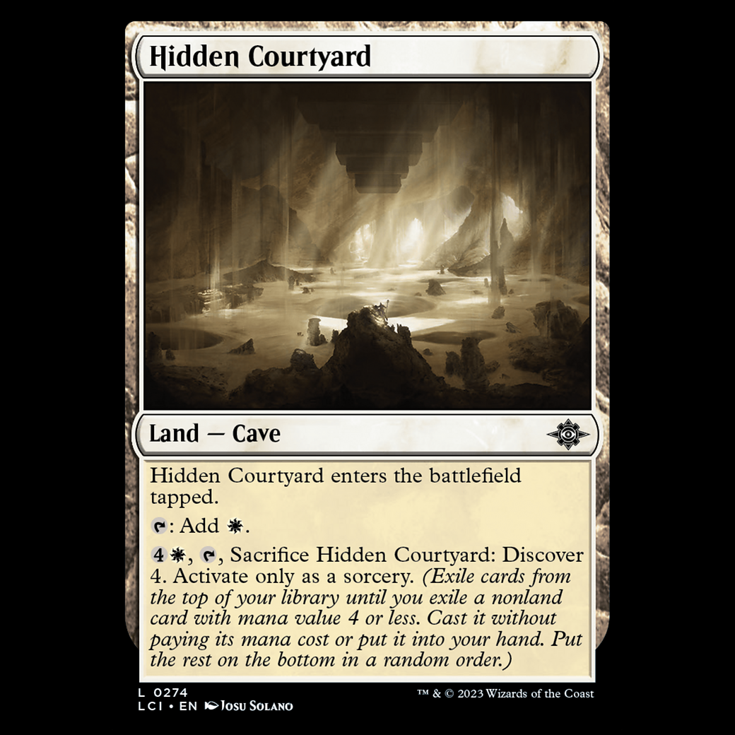 , , Sacrifice Hidden Courtyard: Discover 4. Activate only as a sorcery. (Exile cards from the top of your library until you exile a nonland card with mana value 4 or less. Cast it without paying its mana cost or put it into your hand. Put the rest on the bottom in a random order.)