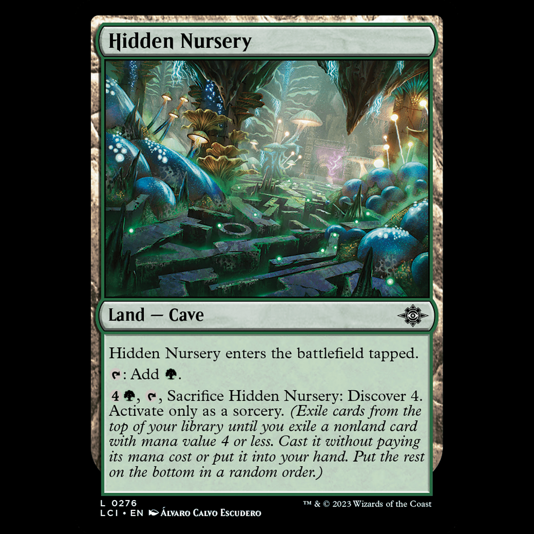 , , Sacrifice Hidden Nursery: Discover 4. Activate only as a sorcery. (Exile cards from the top of your library until you exile a nonland card with mana value 4 or less. Cast it without paying its mana cost or put it into your hand. Put the rest on the bottom in a random order.)