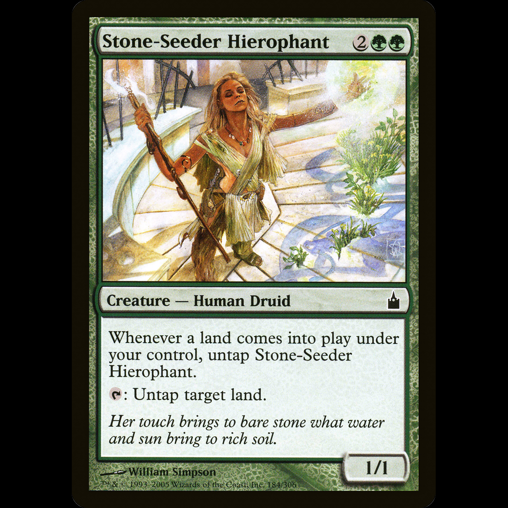 Landfall — Whenever a land enters the battlefield under your control, untap Stone-Seeder Hierophant.