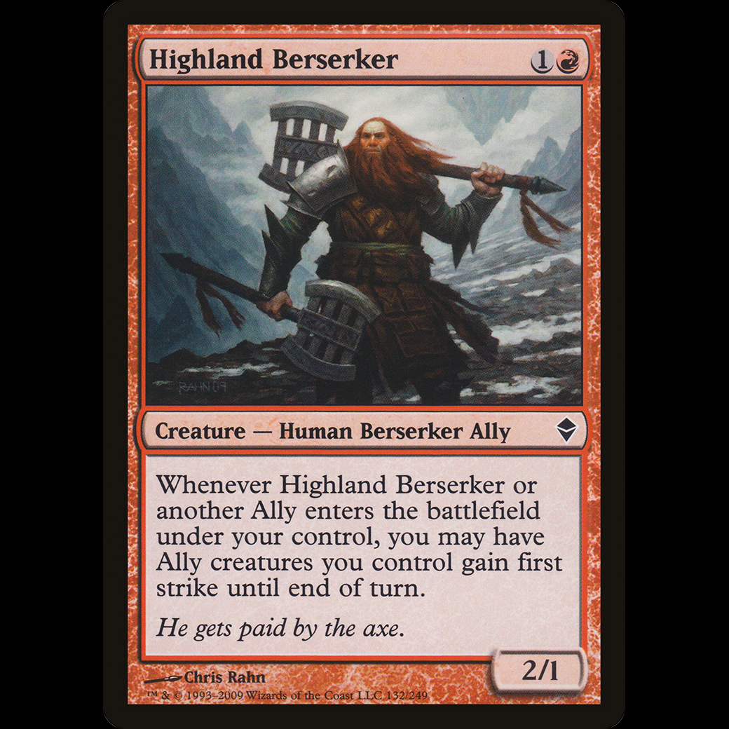 Whenever Highland Berserker or another Ally enters the battlefield under your control, you may have Ally creatures you control gain first strike until end of turn.