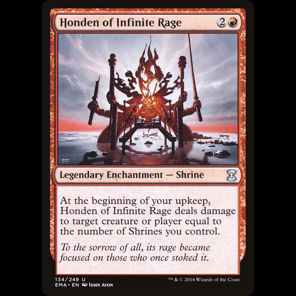 At the beginning of your upkeep, Honden of Infinite Rage deals damage to any target equal to the number of Shrines you control.