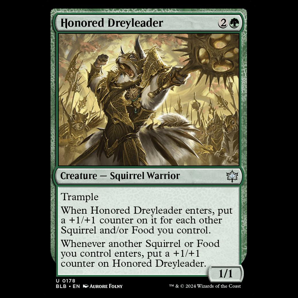 When Honored Dreyleader enters, put a +1/+1 counter on it for each other Squirrel and/or Food you control.