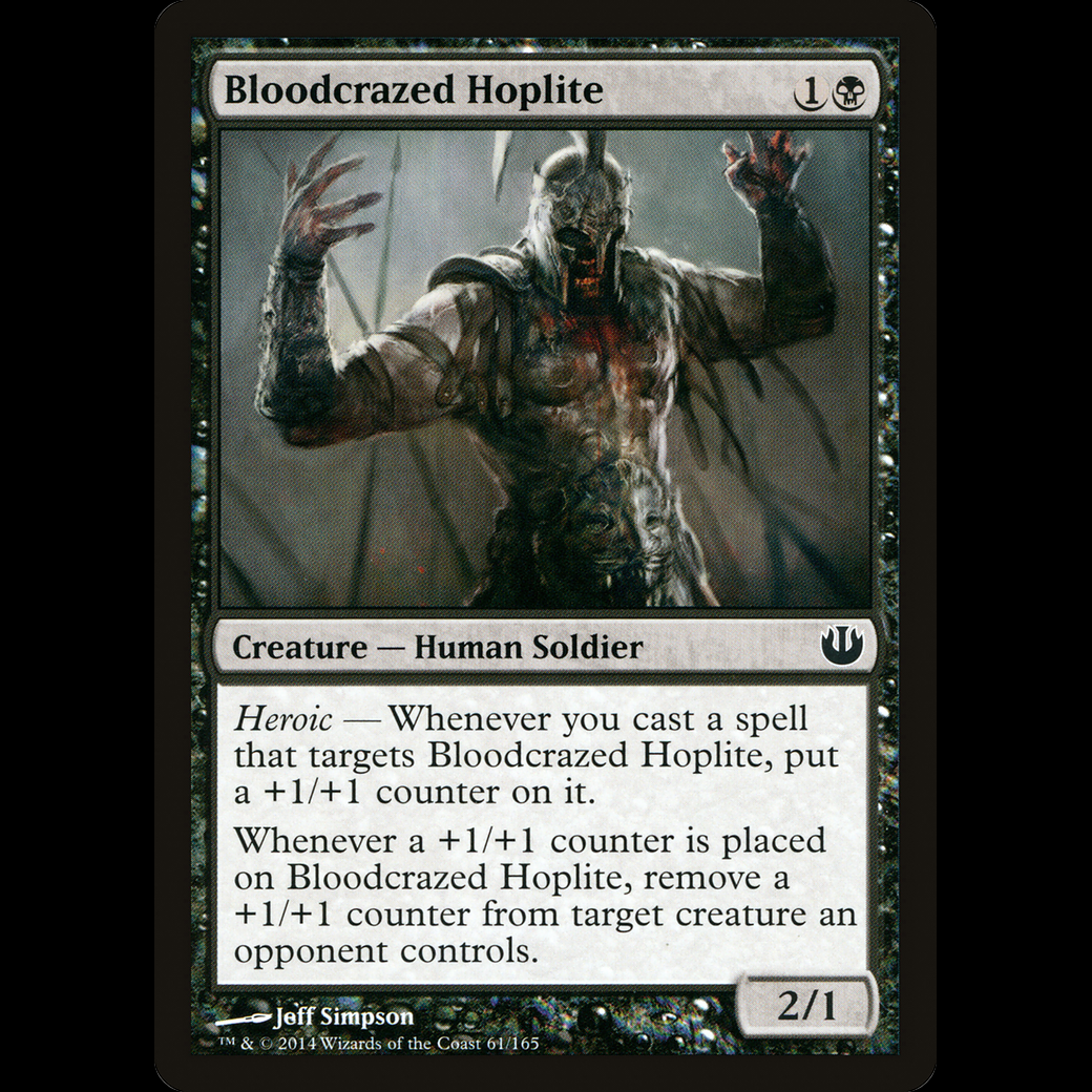 Heroic — Whenever you cast a spell that targets Bloodcrazed Hoplite, put a +1/+1 counter on it.