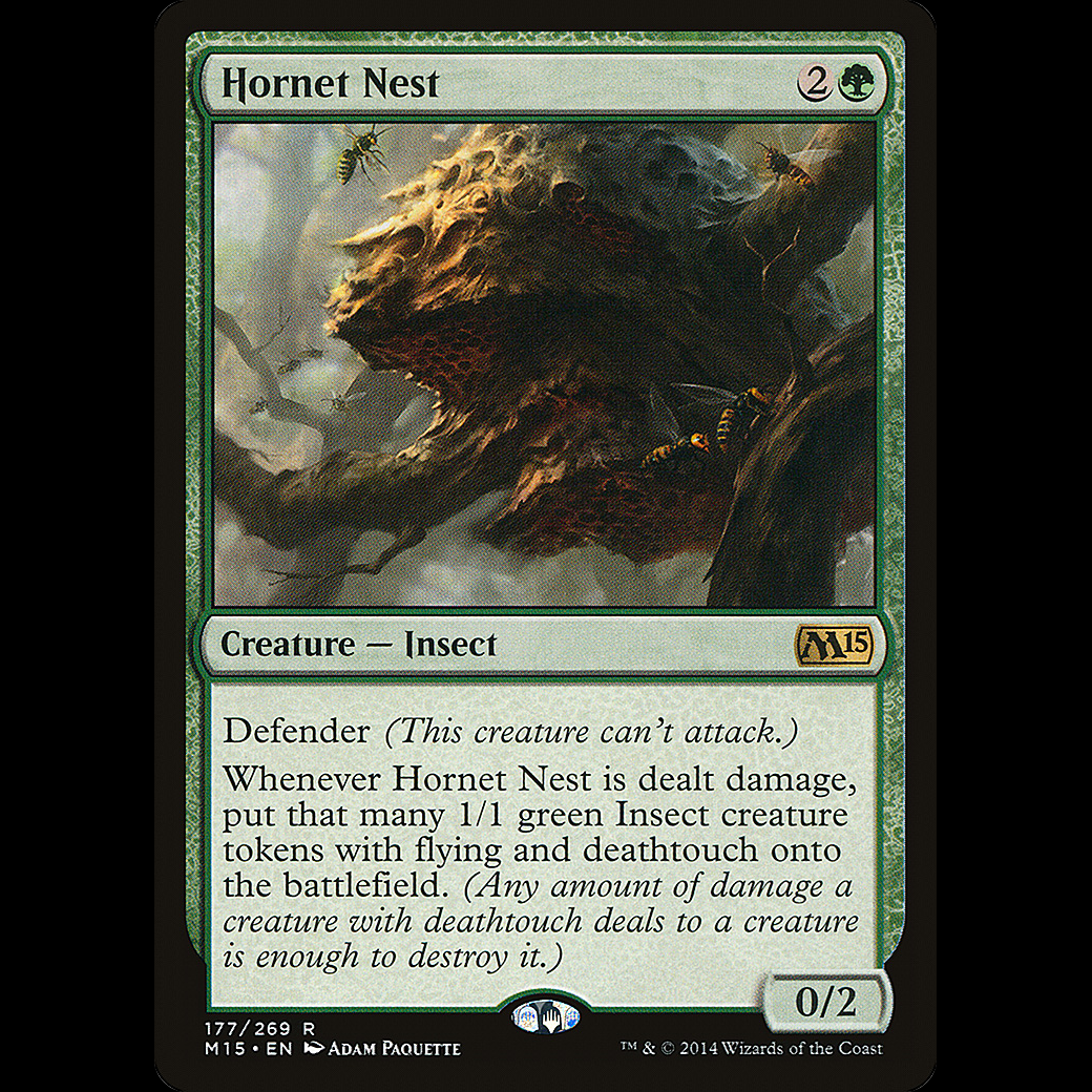 Whenever Hornet Nest is dealt damage, create that many 1/1 green Insect creature tokens with flying and deathtouch. (Any amount of damage a creature with deathtouch deals to a creature is enough to destroy it.)
