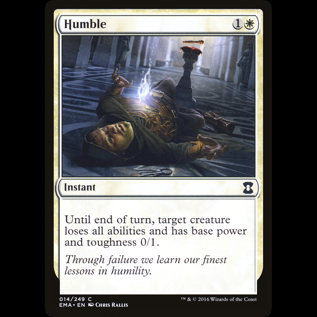Until end of turn, target creature loses all abilities and has base power and toughness 0/1.