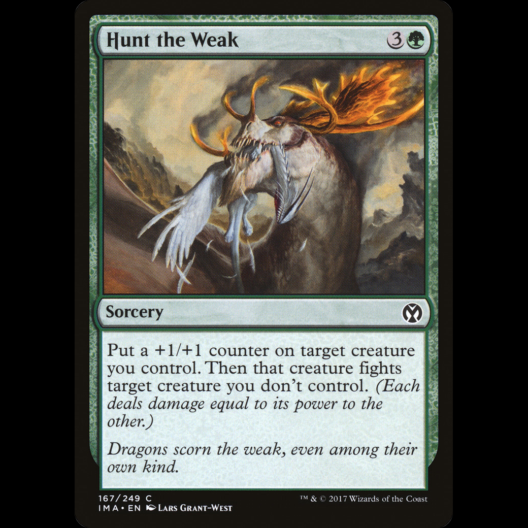 MTG Hunt the Weak Iconic Masters ima#167Put a +1/+1 counter on target creature you control. Then that creature fights target creature you don't control. (Each deals damage equal to its power to the other.)