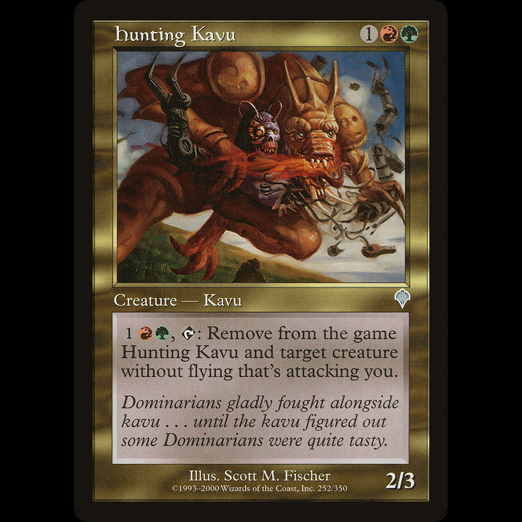 , : Exile Hunting Kavu and target creature without flying that's attacking you.