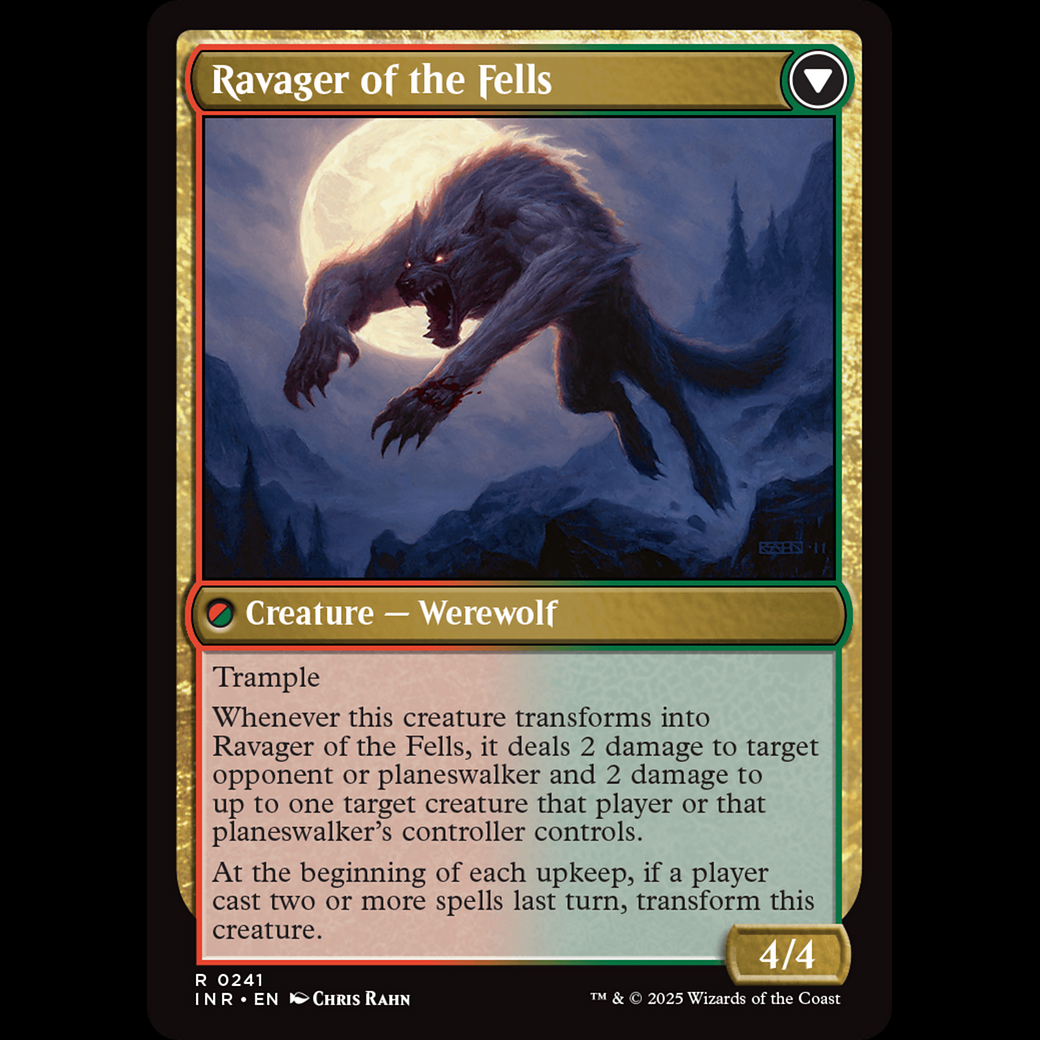 Whenever this creature transforms into Ravager of the Fells, it deals 2 damage to target opponent or planeswalker and 2 damage to up to one target creature that player or that planeswalker's controller controls.