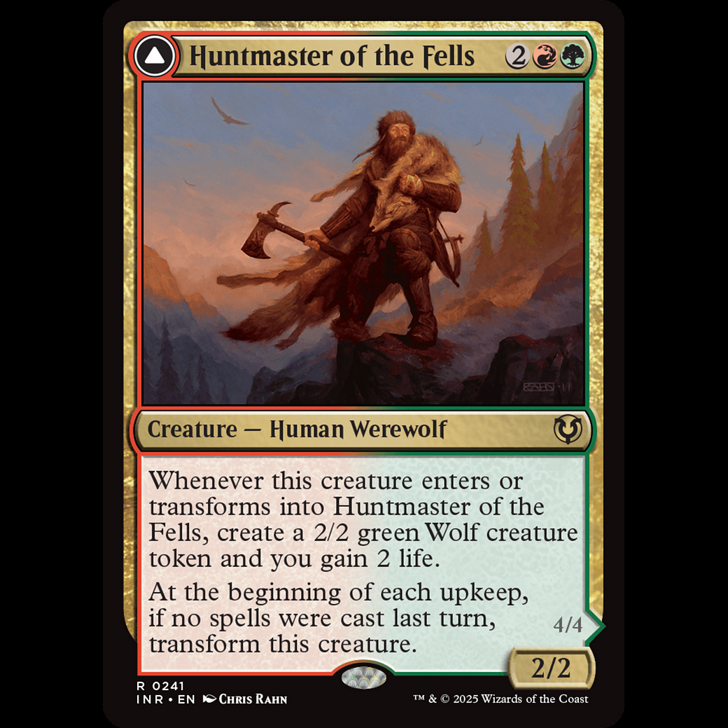 Whenever this creature enters or transforms into Huntmaster of the Fells, create a 2/2 green Wolf creature token and you gain 2 life.