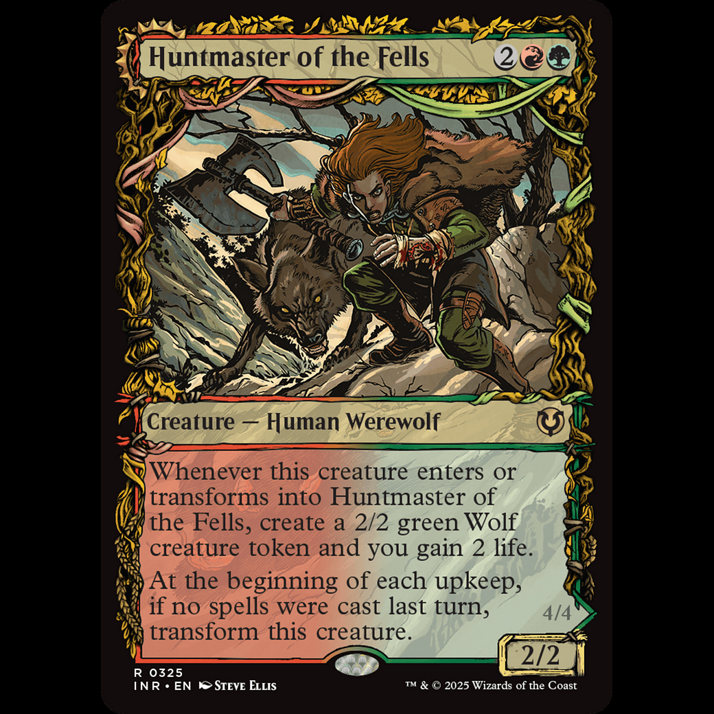 Whenever this creature enters or transforms into Huntmaster of the Fells, create a 2/2 green Wolf creature token and you gain 2 life.