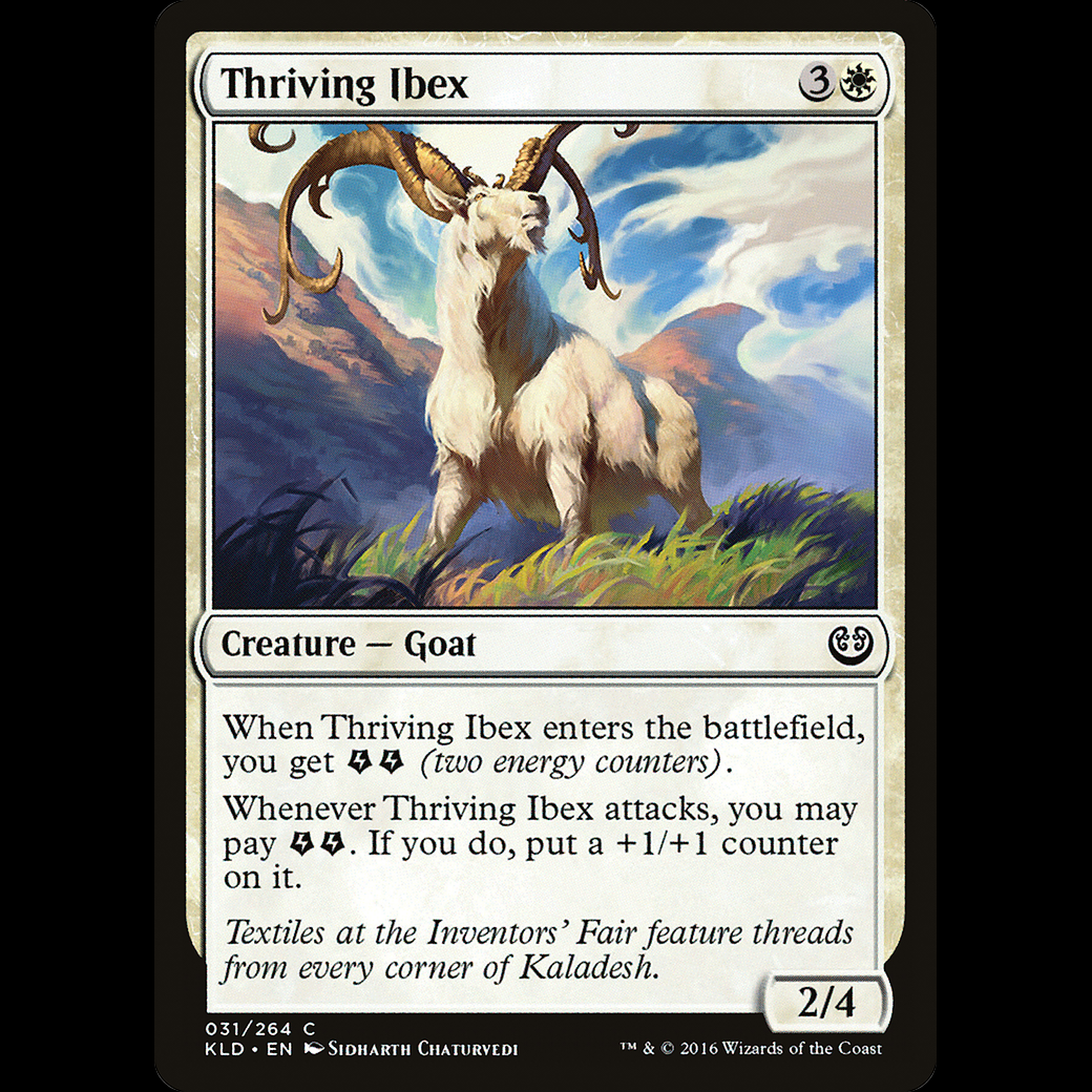 When Thriving Ibex enters the battlefield, you get (two energy counters).