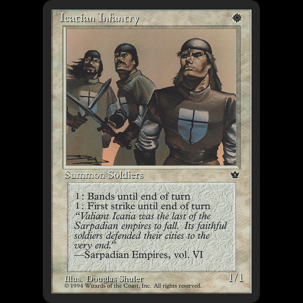 : Icatian Infantry gains banding until end of turn. (Any creatures with banding, and up to one without, can attack in a band. Bands are blocked as a group. If any creatures with banding you control are blocking or being blocked by a creature, you divide that creature's combat damage, not its controller, among any of the creatures it's being blocked by or is blocking.)