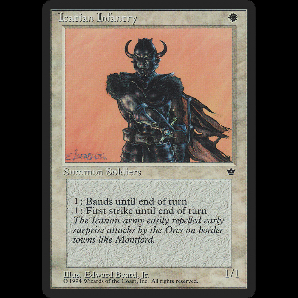 : Icatian Infantry gains banding until end of turn. (Any creatures with banding, and up to one without, can attack in a band. Bands are blocked as a group. If any creatures with banding you control are blocking or being blocked by a creature, you divide that creature's combat damage, not its controller, among any of the creatures it's being blocked by or is blocking.)