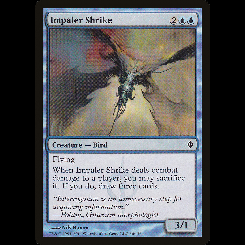 Whenever Impaler Shrike deals combat damage to a player, you may sacrifice it. If you do, draw three cards.