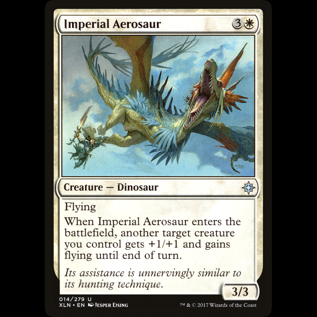When Imperial Aerosaur enters the battlefield, another target creature you control gets +1/+1 and gains flying until end of turn.