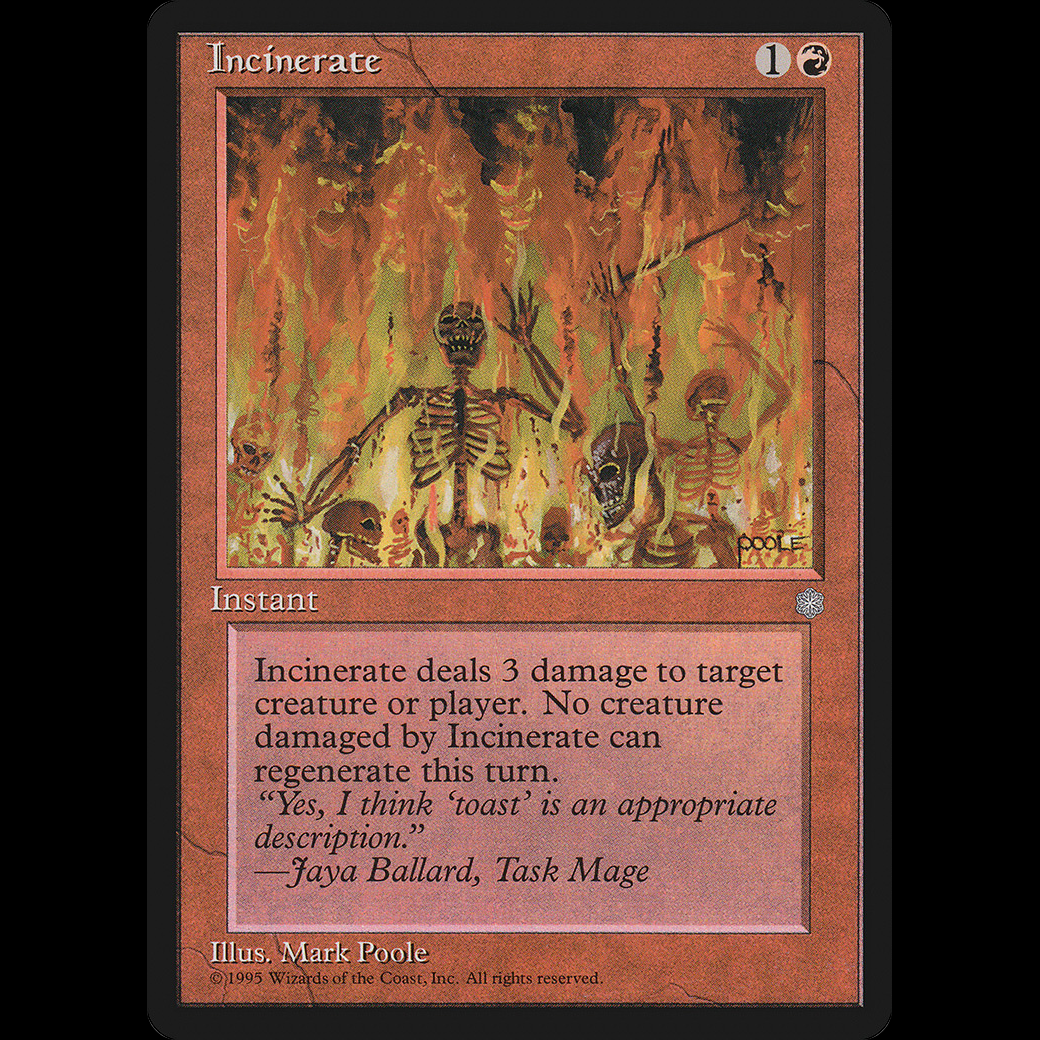 Incinerate deals 3 damage to any target. A creature dealt damage this way can't be regenerated this turn.