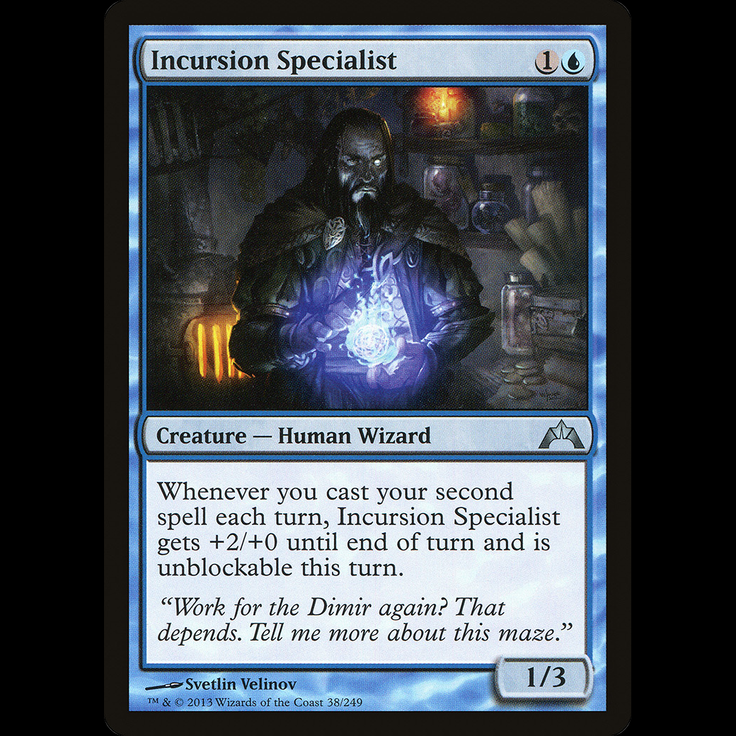 Whenever you cast your second spell each turn, Incursion Specialist gets +2/+0 until end of turn and can't be blocked this turn.
