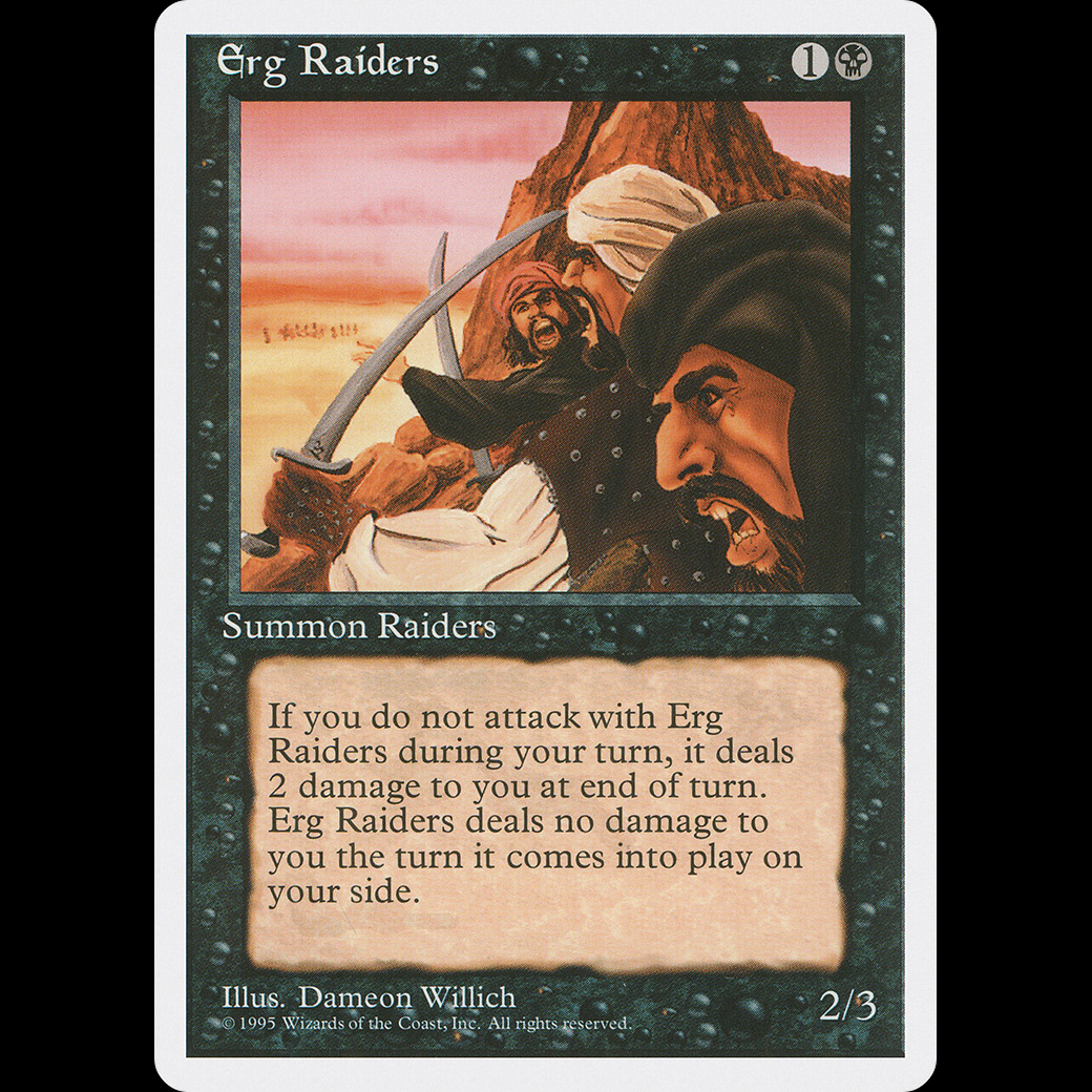 At the beginning of your end step, if Erg Raiders didn't attack this turn, Erg Raiders deals 2 damage to you unless it came under your control this turn.