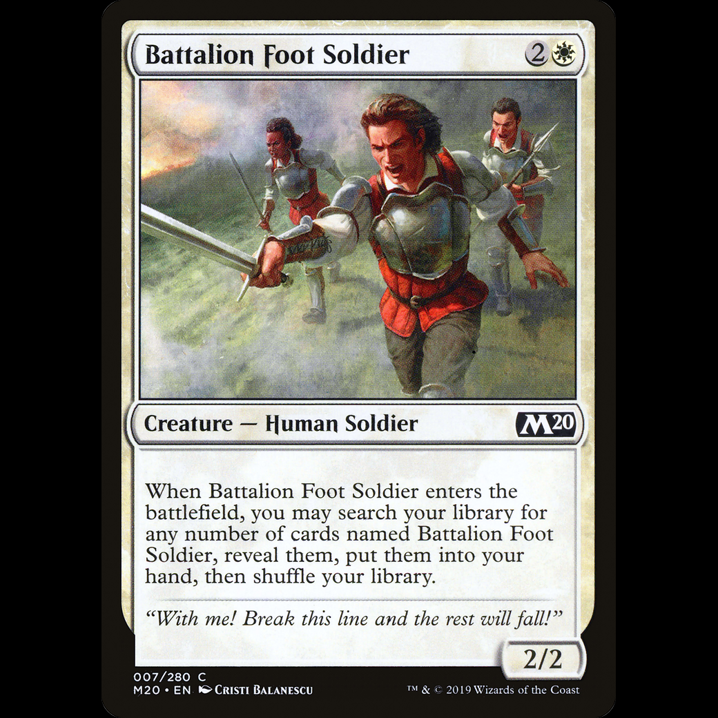When this creature enters, you may search your library for any number of cards named Battalion Foot Soldier, reveal them, put them into your hand, then shuffle.