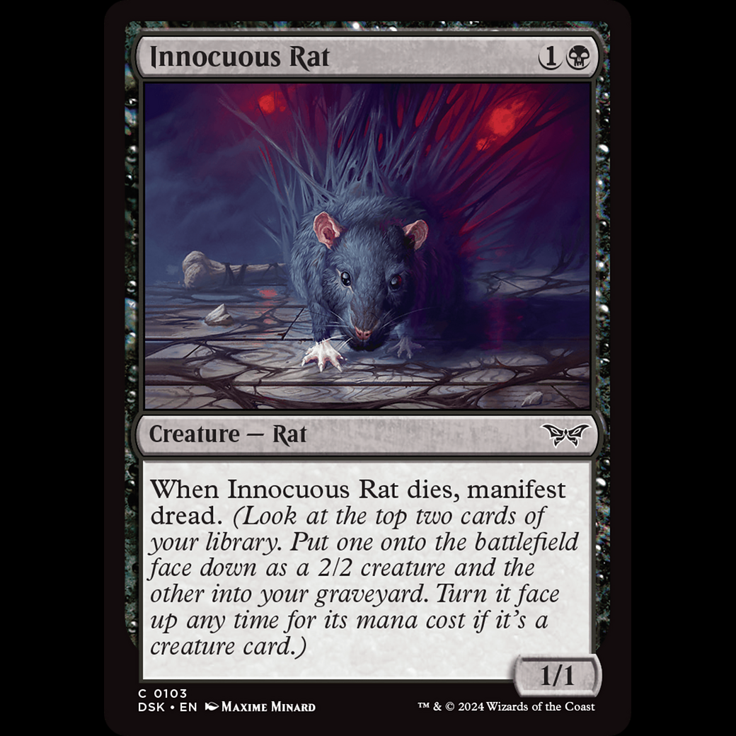 When Innocuous Rat dies, manifest dread. (Look at the top two cards of your library. Put one onto the battlefield face down as a 2/2 creature and the other into your graveyard. Turn it face up any time for its mana cost if it's a creature card.)