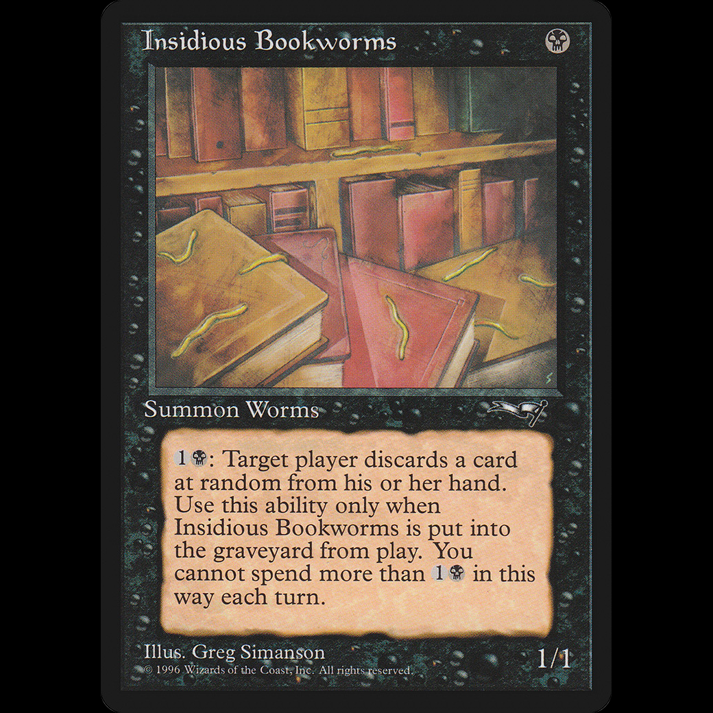 When Insidious Bookworms dies, you may pay . If you do, target player discards a card at random.