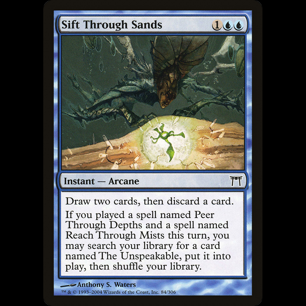 If you've cast a spell named Peer Through Depths and a spell named Reach Through Mists this turn, you may search your library for a card named The Unspeakable, put it onto the battlefield, then shuffle.