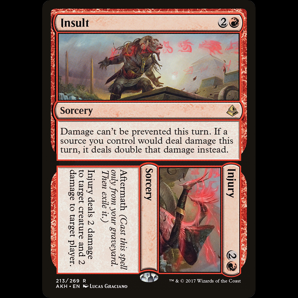 Injury deals 2 damage to target creature and 2 damage to target player or planeswalker.
