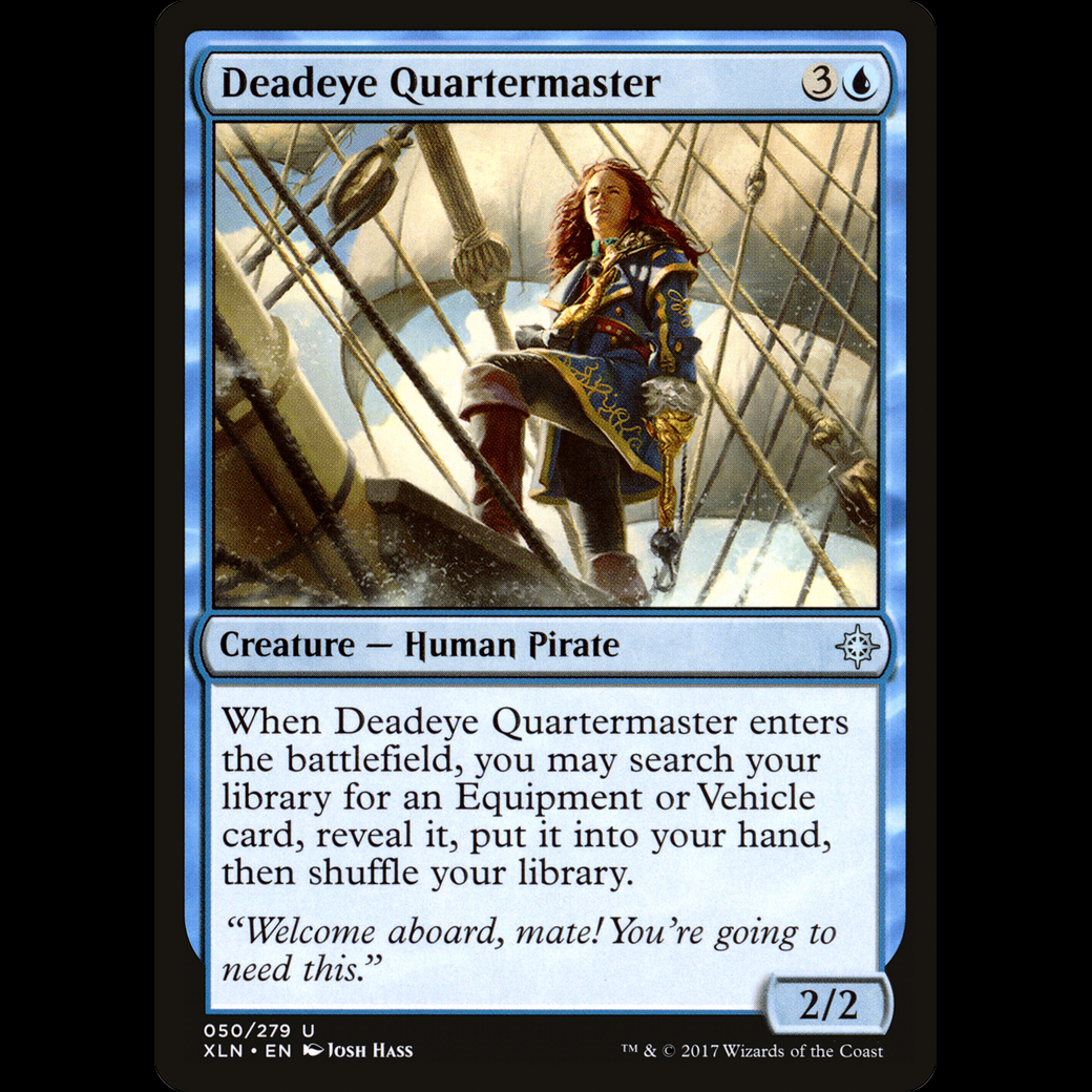 When Deadeye Quartermaster enters, you may search your library for an Equipment or Vehicle card, reveal it, put it into your hand, then shuffle.
