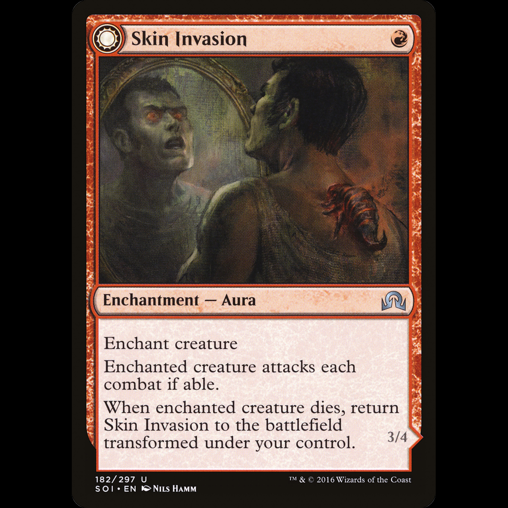When enchanted creature dies, return Skin Invasion to the battlefield transformed under your control. //