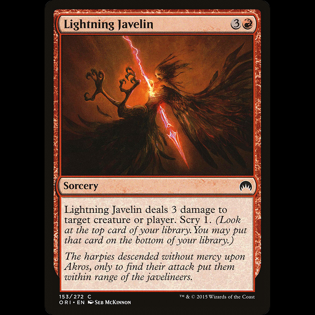 Lightning Javelin deals 3 damage to any target. Scry 1. (Look at the top card of your library. You may put that card on the bottom of your library.)