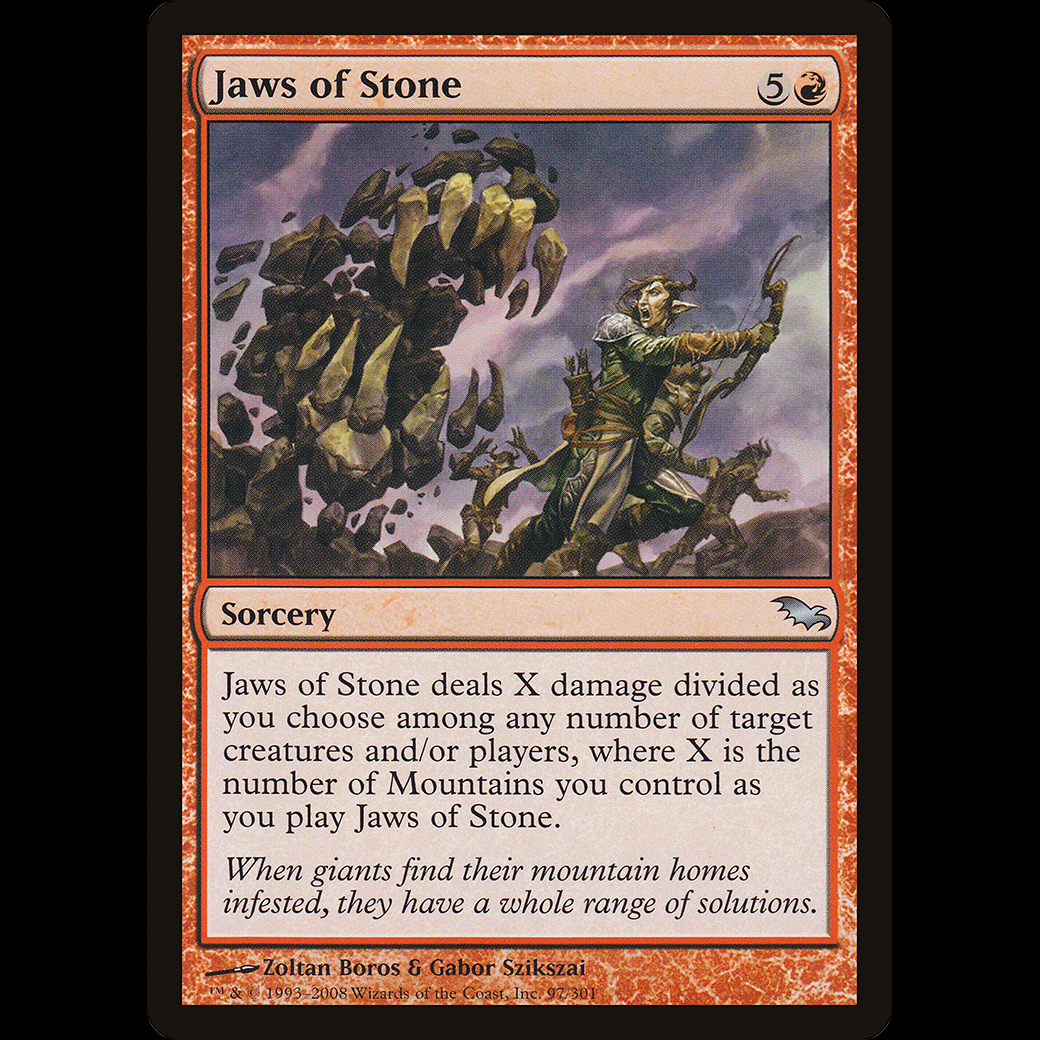 Jaws of Stone deals X damage divided as you choose among any number of targets, where X is the number of Mountains you control as you cast this spell.
